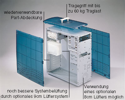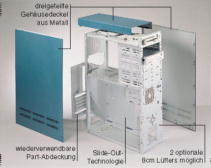 6x 5,25" plus 2x 3,5", 4x 3,5" intern, 300Watt Netzteil, ohne scharfe